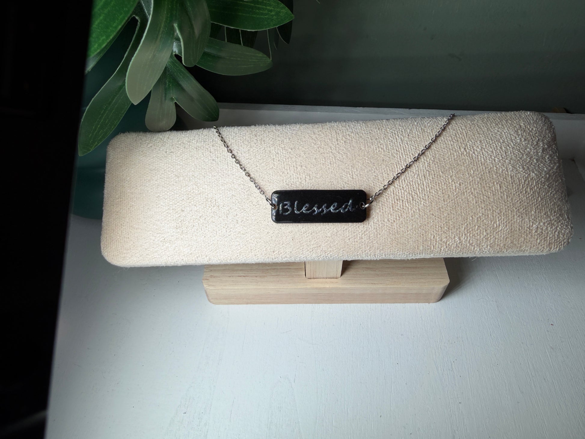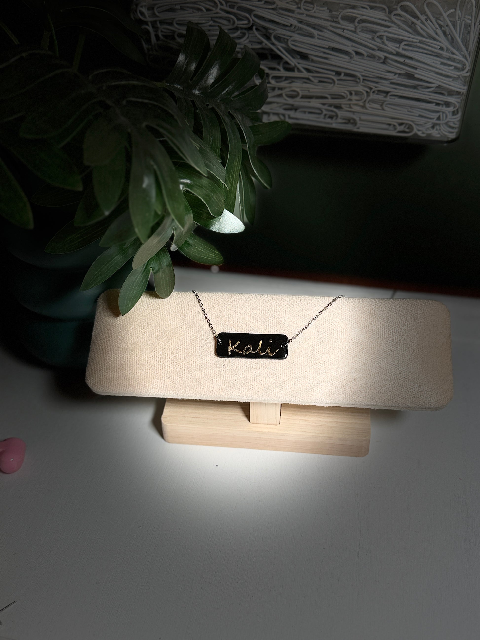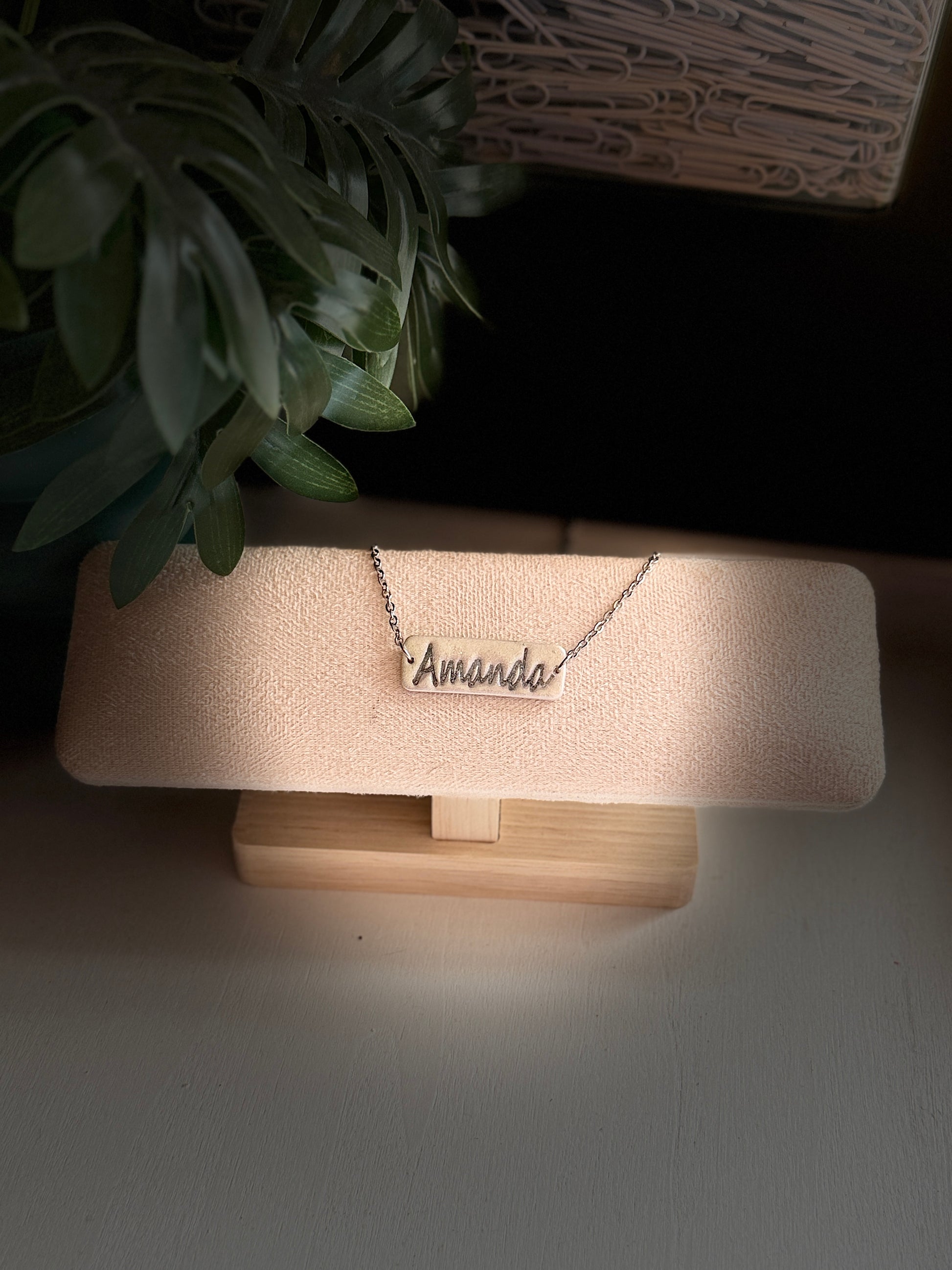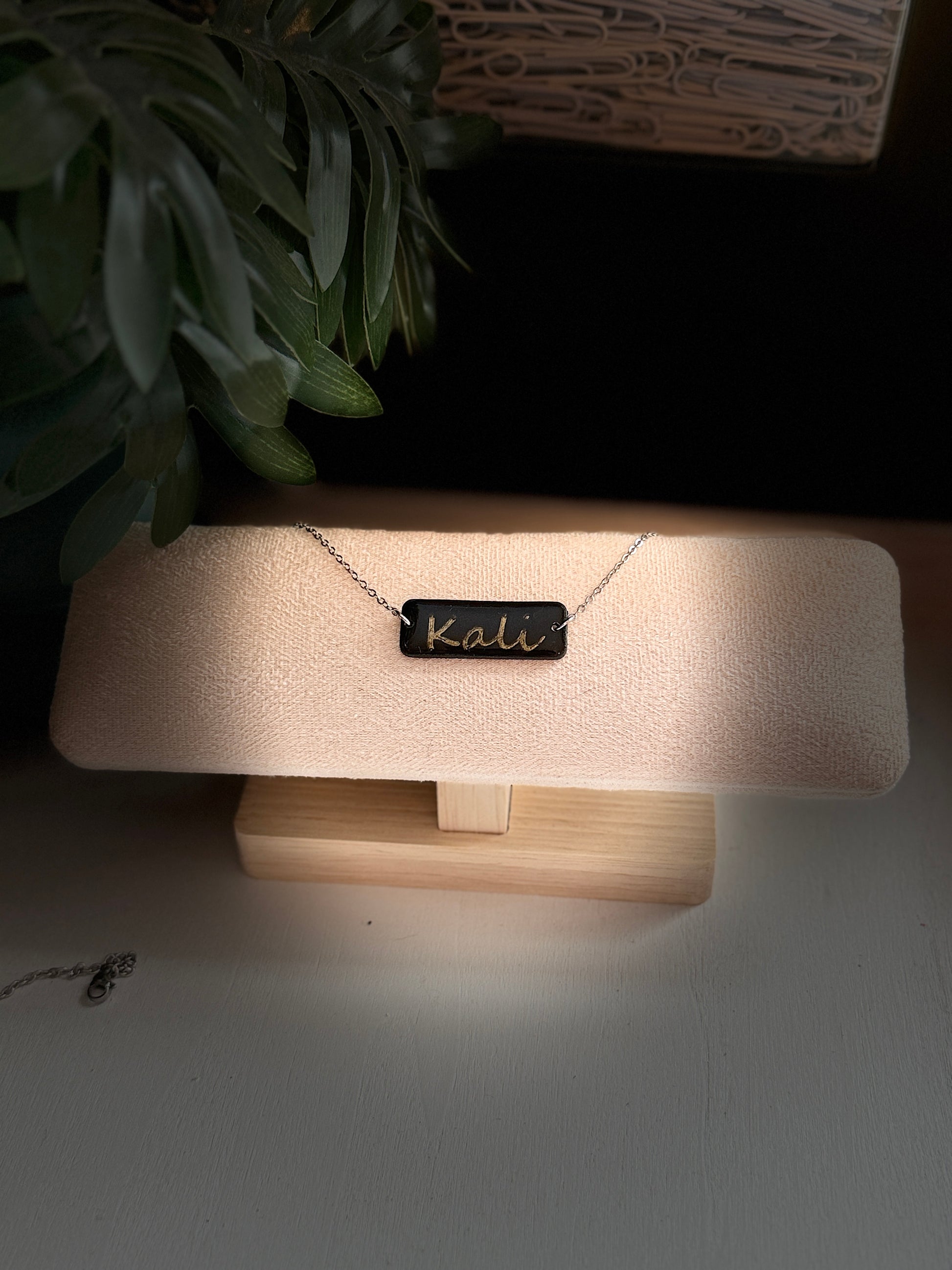 Handcrafted clay name bar with metal chain