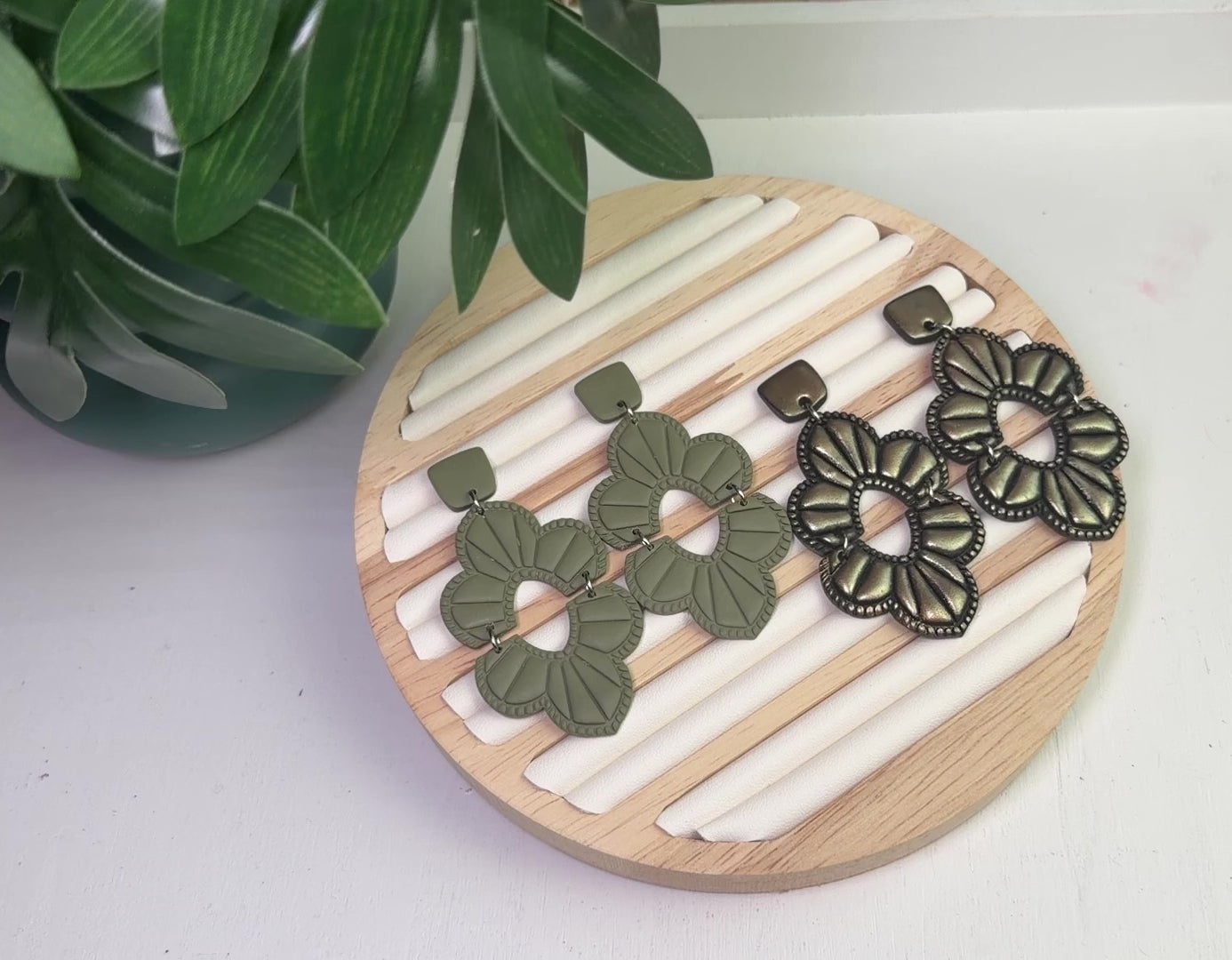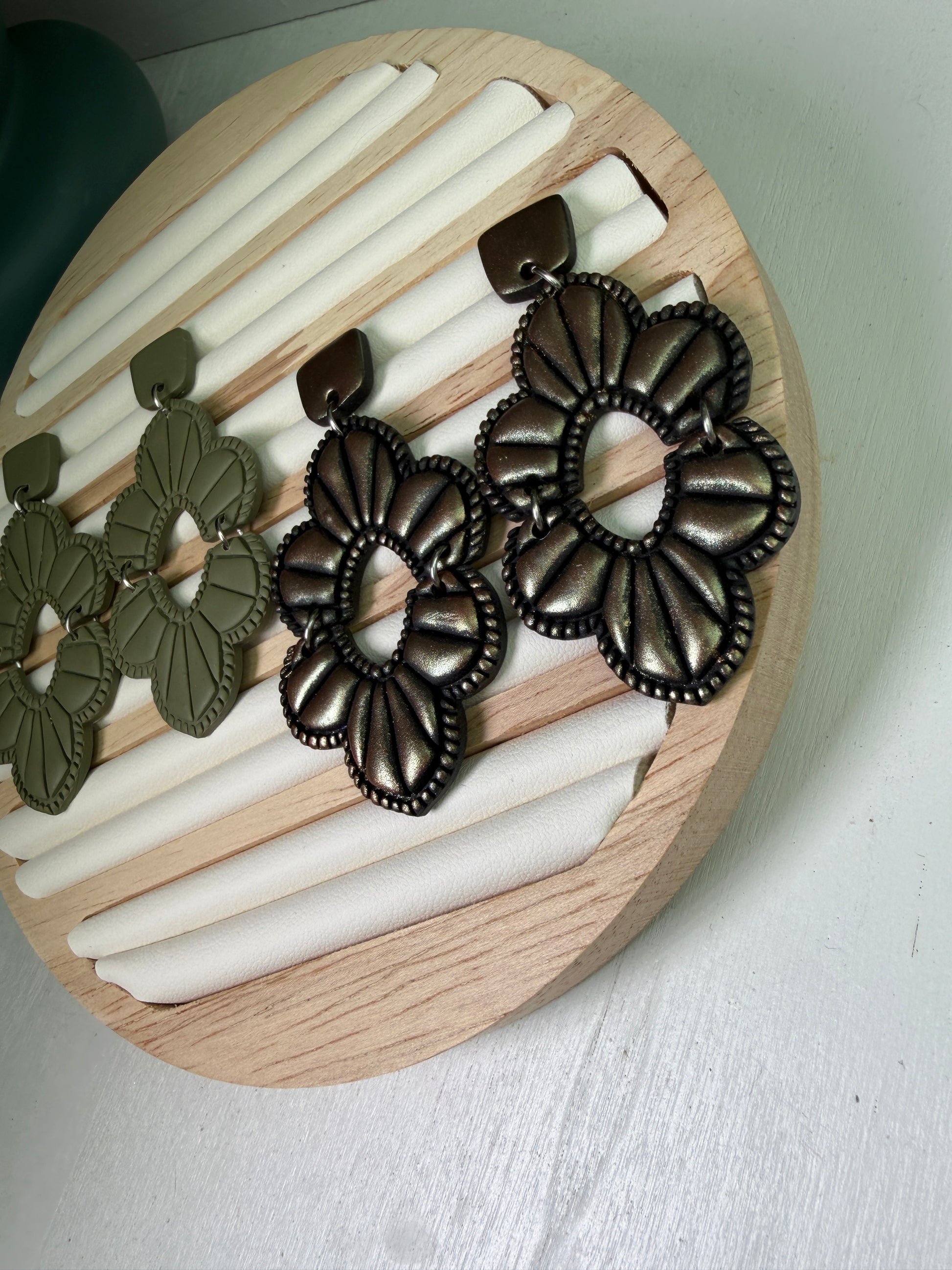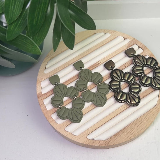 The Western Blossom Earrings blend soft floral elegance with a subtle western-inspired charm. Their sculpted flower shape and earthy sage tone create a statement look that feels both grounded and graceful.