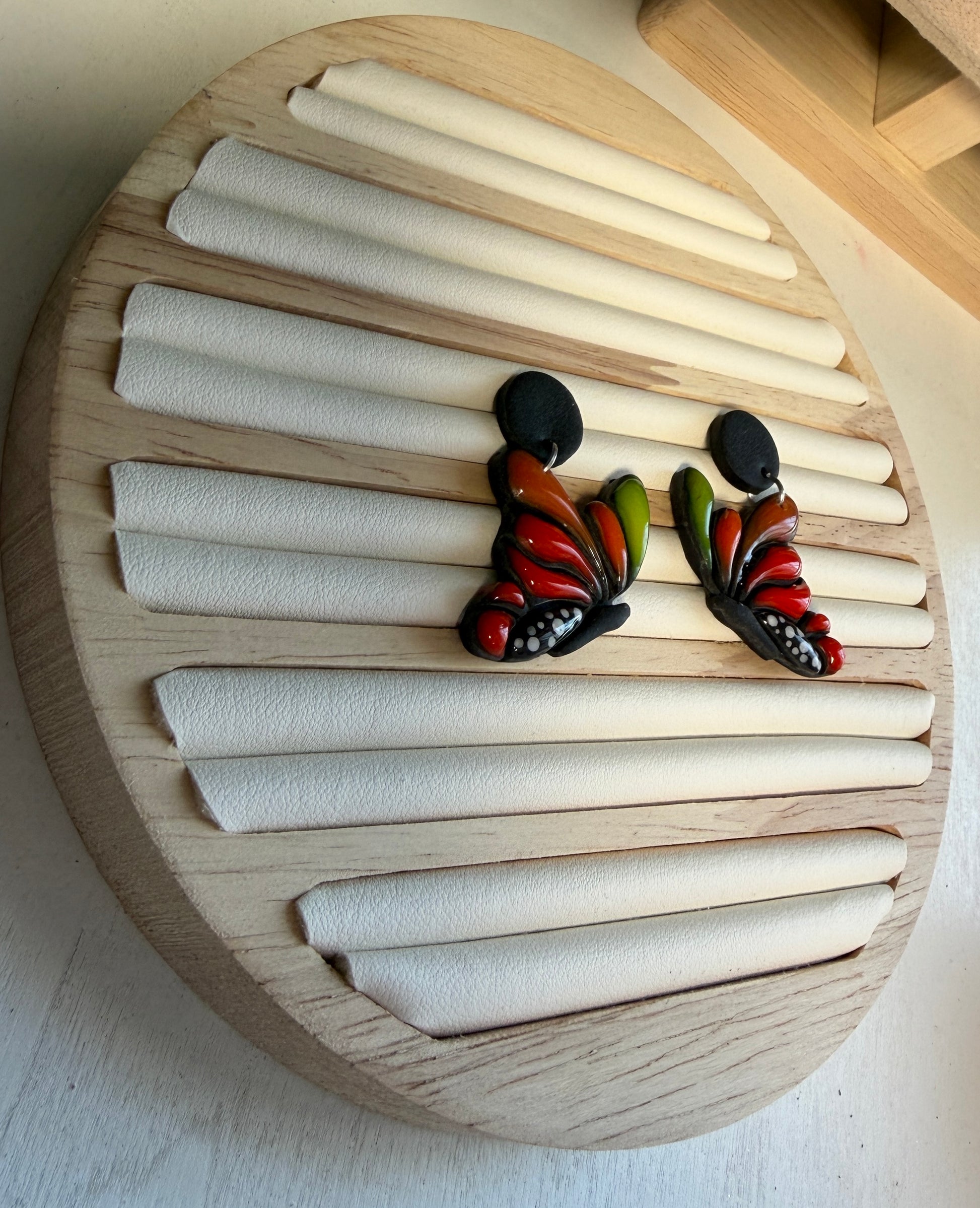 Bold, expressive, and full of movement, the Harvest Wing Dangles are inspired by vibrant butterfly wings in rich autumn tones. Layers of deep red, burnt orange, olive green, and black come together in a sculptural, winged design that feels both artistic and empowering. These are statement earrings made to be noticed.