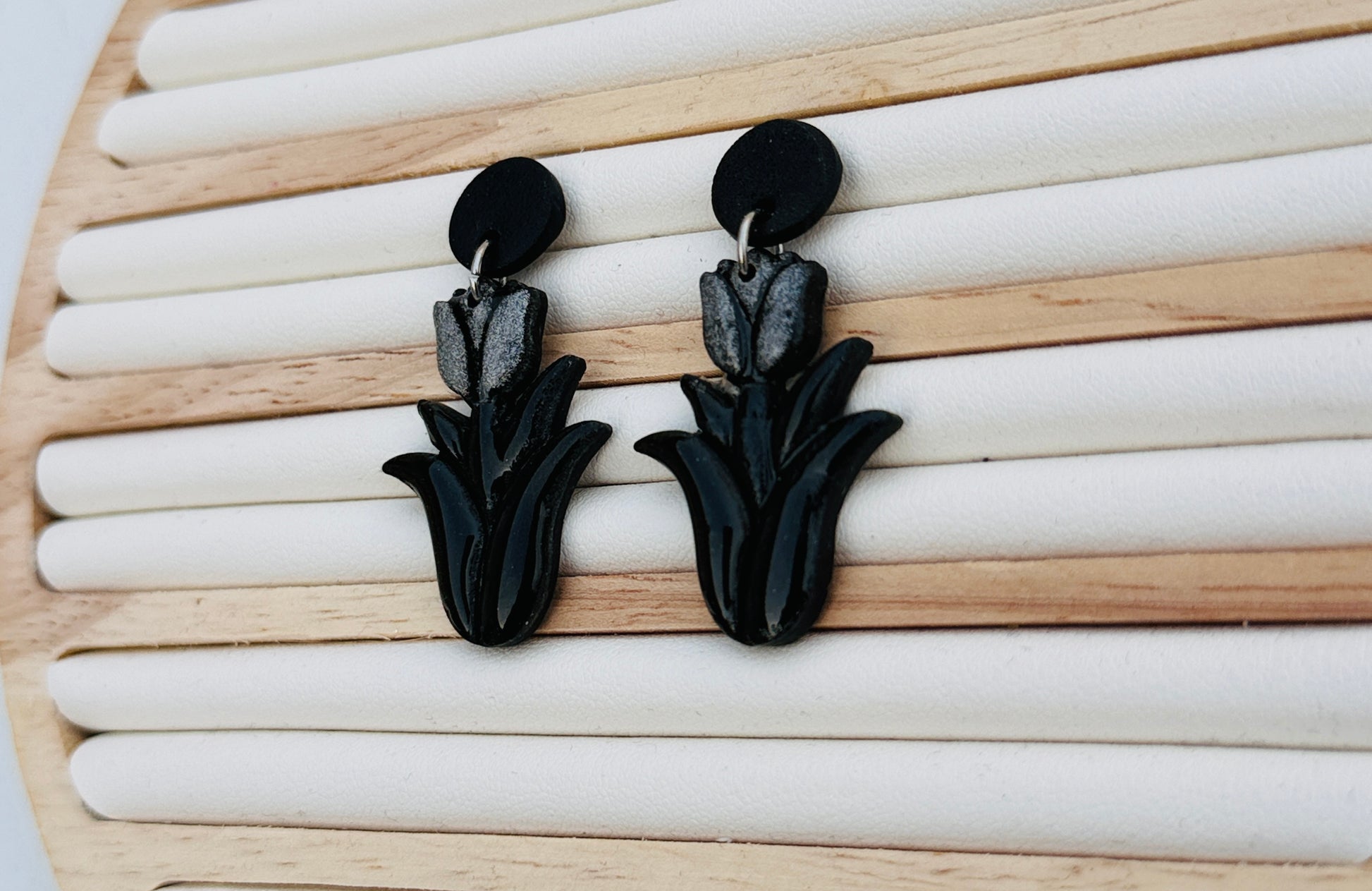 These handcrafted floral earrings feature a sleek, elongated bloom silhouette with layered detailing that gives them a bold yet elegant look. The deep, moody tones create a dramatic statement while still feeling timeless and wearable.