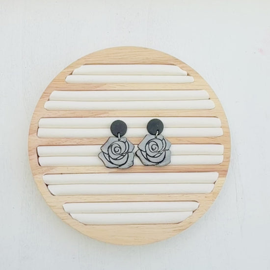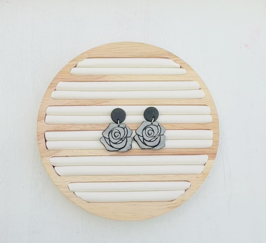 These handcrafted rose earrings feature an elegant floral silhouette with soft dimension and engraved detailing. The layered rose design adds a romantic touch with a slightly moody edge, making them perfect for everyday wear or a dressed-up look.